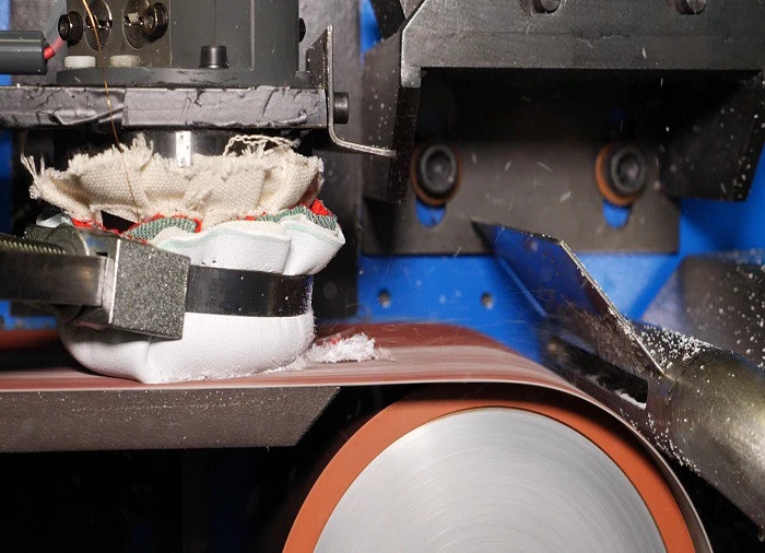 4つ目は、ソール磨耗試験です。衝撃磨耗試験と同様の方法で行われます。ソールのサンプルを粗い動く表面に接触させ、アスファルト上での長時間の磨耗に対する耐性をテストします。
